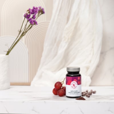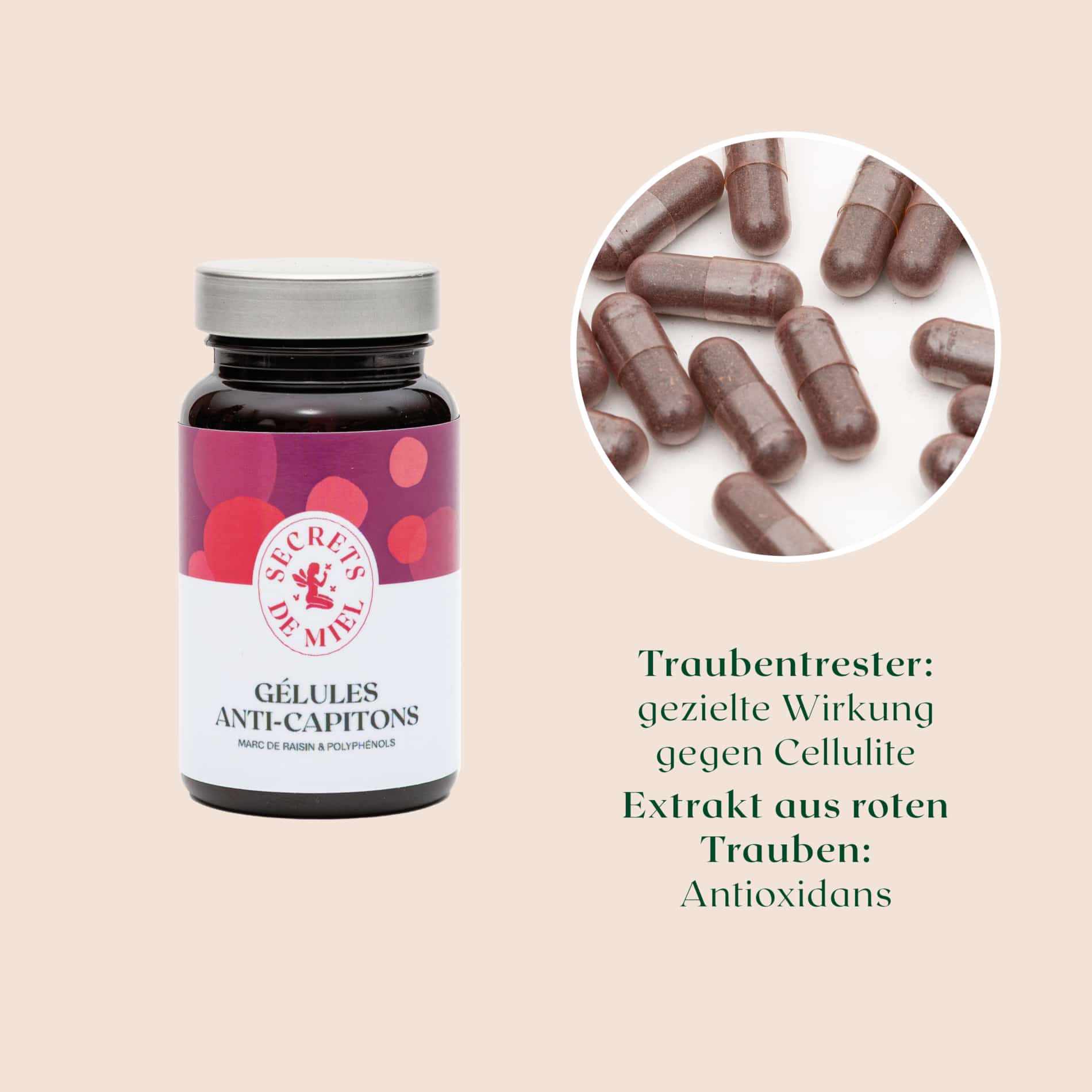 Die Anti-Cellulite-Kapseln vereinen die besten Wirkstoffe aus der Weinrebe in einer Expertenformel, die gezielt auf den Orangenhaut-Effekt ausgerichtet ist. Traubentrester trägt dazu bei, dem Orangenhaut-Effekt entgegenzuwirken, indem er gezielt auf Cellulite wirkt. Er wird mit einem Extrakt aus rotem Weinlaub kombiniert, der polyphenolstandardisiert ist und für seine antioxidativen Schutzeigenschaften bekannt ist.
