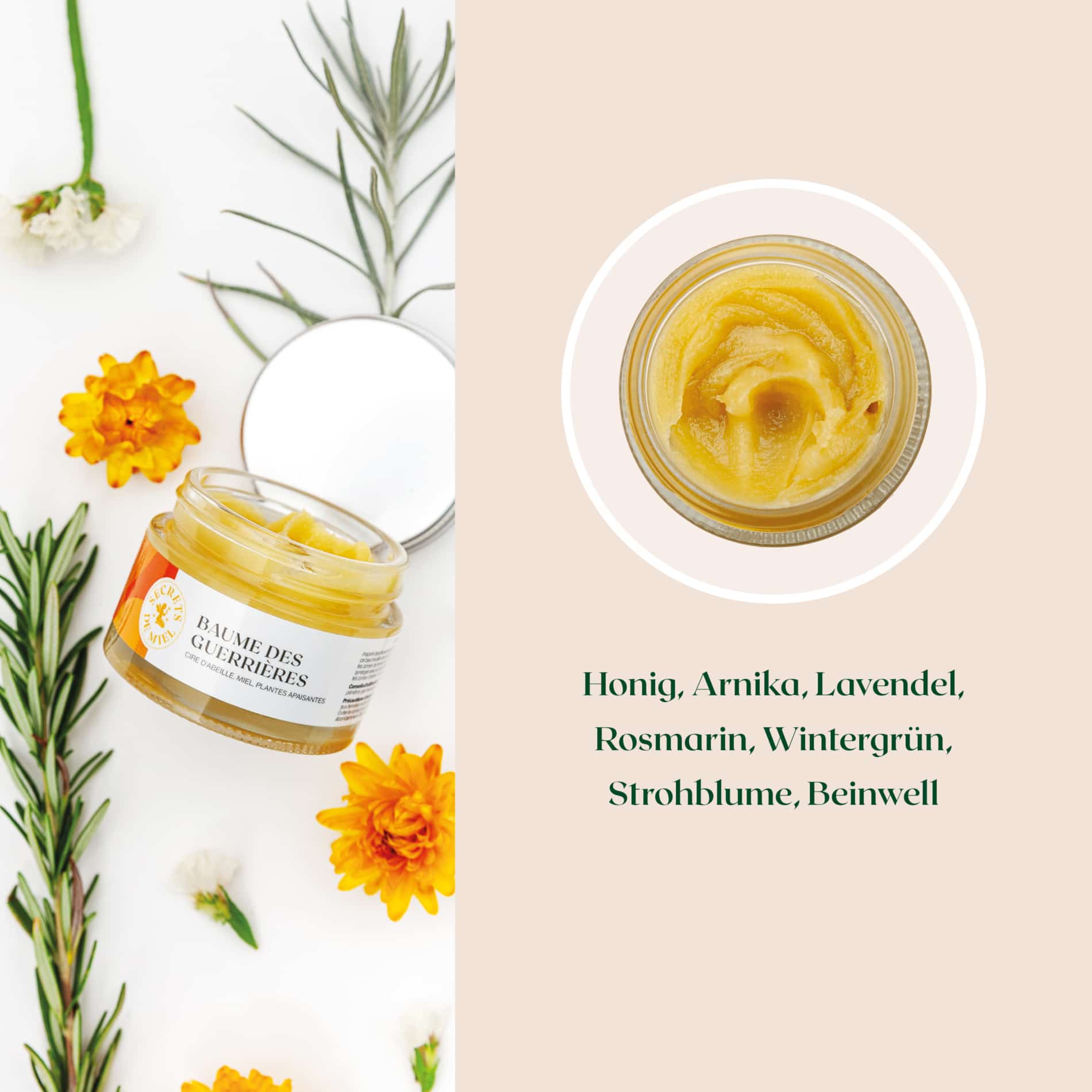 Vollständige Zutatenliste: OLEA EUROPAEA FRUIT OIL (Olivenöl), CERA ALBA (Bienenwachs), COCOS NUCIFERA OIL (Kokosöl), SESAMUM INDICUM SEED OIL (Sesamöl), MEL (Honig), ARNICA MONTANA FLOWER EXTRACT (Arnikablütenextrakt), ROSMARINUS OFFICINALIS FLOWER OIL (Rosmarinblütenöl), GAULTHERIA PROCUMBENS LEAF OIL (Wintergrünblattöl), LAVANDULA LUISERI OIL (Lavendelöl), HELICHRYSUM ANGUSTIFOLIUM FLOWER OIL (Immortellenblütenöl), SYMPHYTUM OFFICINALIS LEAF EXTRACT (Beinwellblattextrakt), LIMONENE (Limonen), LINALOOL (Linalool), EUGENOL (Eugenol), GERANIOL (Geraniol).