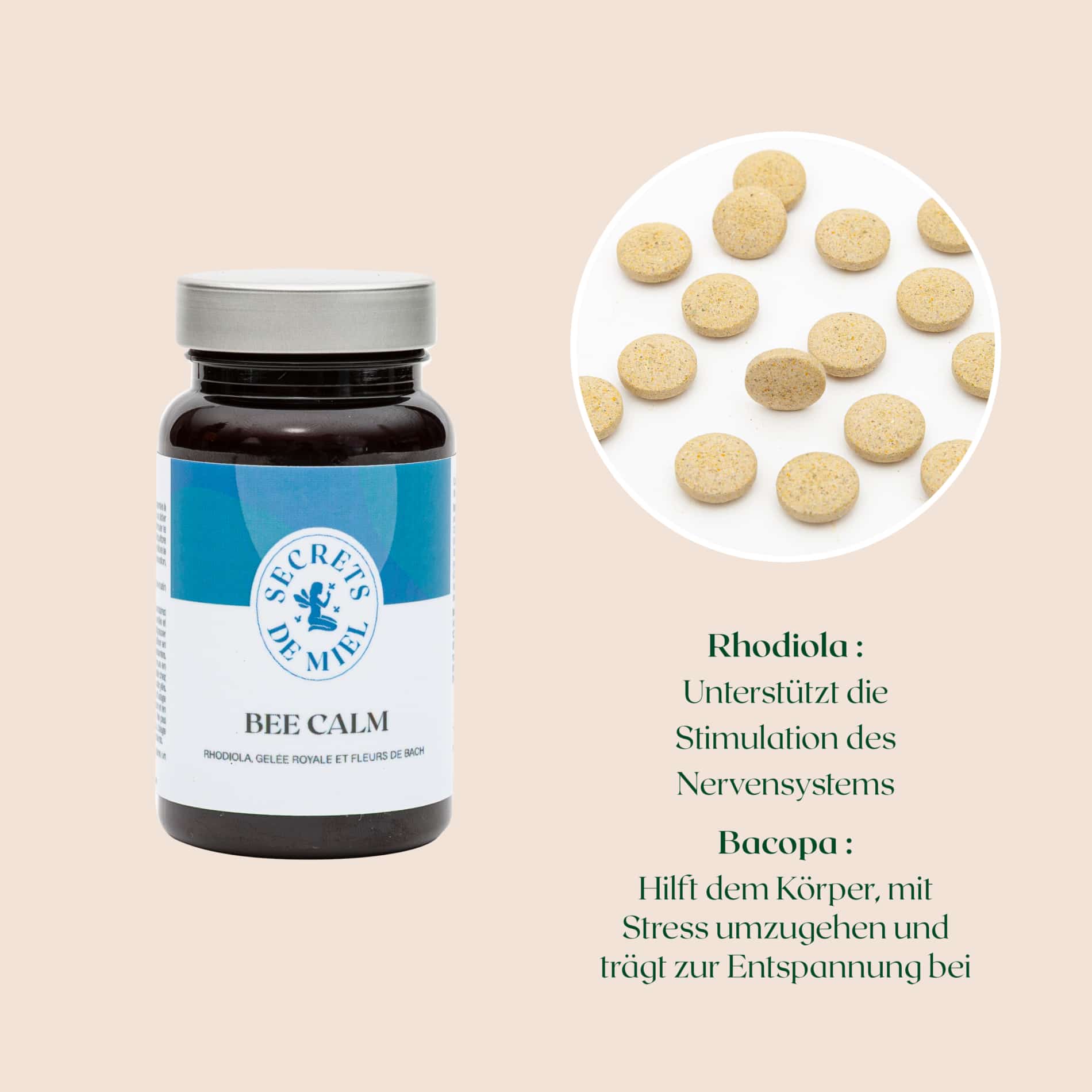 Bee’Calm ist ein Nahrungsergänzungsmittel, das zur Begleitung intensiver oder langanhaltender Stressphasen entwickelt wurde und das emotionale Gleichgewicht unterstützt. Die natürliche Formel kombiniert die Kraft ausgewählter Pflanzen mit Gelée Royale und Bachblüten, um dabei zu helfen, Stress im Alltag besser zu bewältigen. Rosenwurz trägt zur Stimulation des Nervensystems bei. Bacopa hilft, das mentale Gleichgewicht in stressigen Situationen zu erhalten, verbessert die Stressresistenz des Körpers und fördert die Entspannung. Bee’Calm ist somit ein umfassender Begleiter zur Beruhigung von Körper und Geist – insbesondere dann, wenn das Tempo zunimmt oder die mentale Belastung steigt.