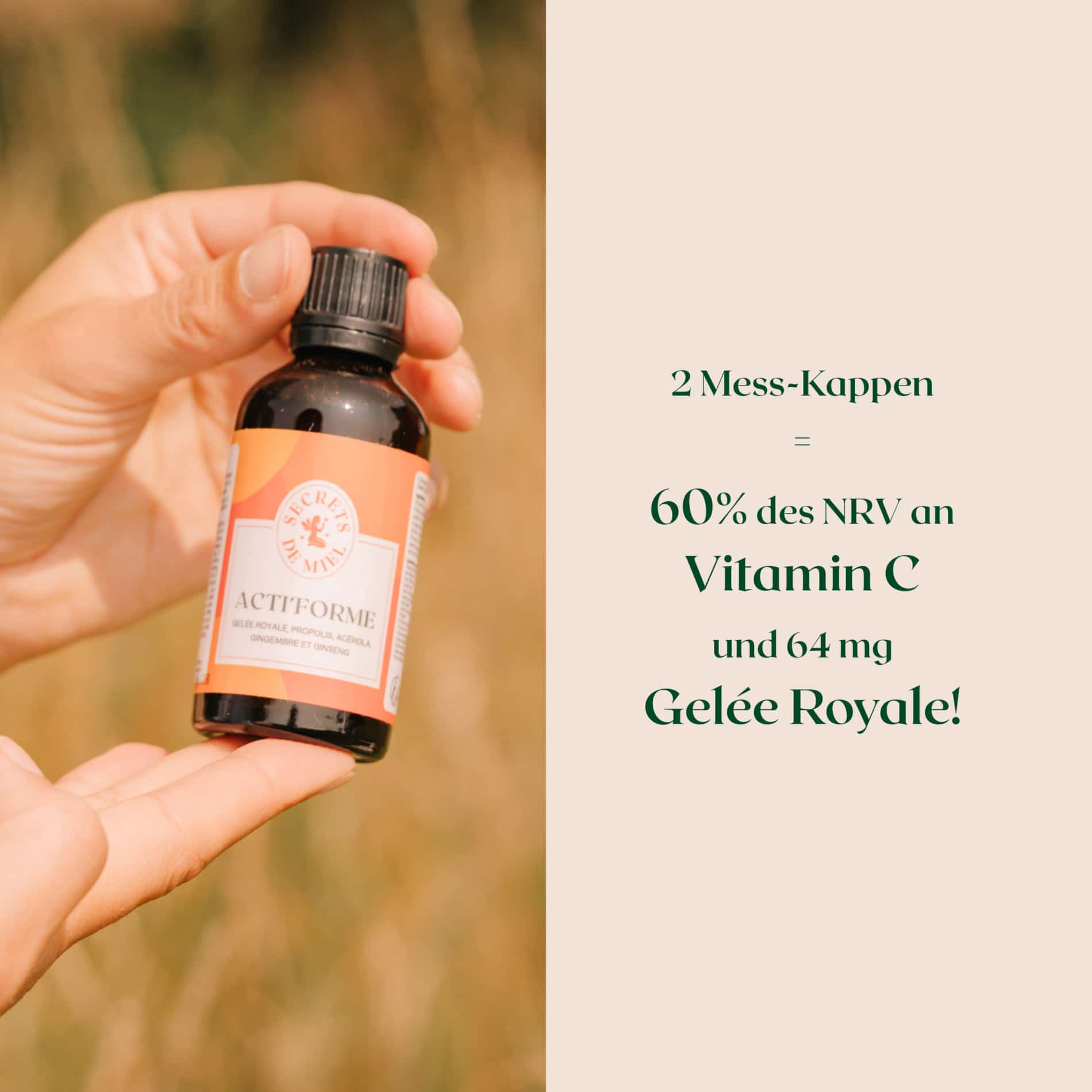 Nahrungsergänzungsmittel auf der Basis von Pflanzen, Gelee Royale, Propolis und Vitamin C.