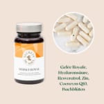Lyophilisiertes Gelée Royale, Kapselhülle: Hydroxypropylmethylcellulose, Trockenextrakt aus Weintrauben (Vitis vinifera), Trockenextrakt aus Goji (Lycium barbarum L. ), Tabashir Bambuspulver (Bambusa bambos), Vitamin C (L-Ascorbinsäure), Hyaluronsäure, Vitamin E (D-alpha-Tocopherol-Acetat), Zinkbisglycinat, Glutathion, Selen auf Hefe, Trockenextrakt aus Granatapfel (Punica granatum), Resveratol, Co-Enzym Q10, L-Carnosin-Pulver, Bethlehemstern Bachblüten Elixier (Ornithogalum umbellatum),