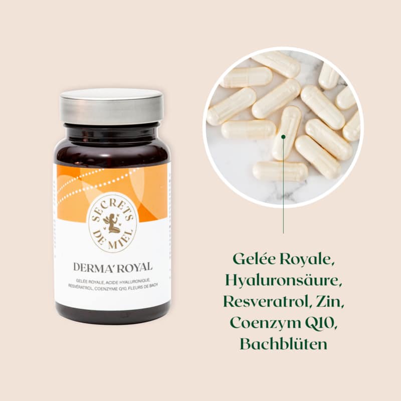 Derma’Royal ist ein Nahrungsergänzungsmittel mit Gelee Royale, Hyaluronsäure, Resveratrol und Coenzym Q10, das wirkt, das dazu beiträgt, die Jugendlichkeit und Schönheit Ihrer Haut zu bewahren.