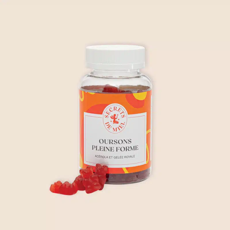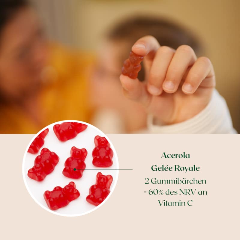 Diese Gummibärchen sind mit Gelée Royale, Acerola und Vitamin C angereichert, die für ihre schützenden, antioxidativen und beruhigenden Eigenschaften bekannt sind. Dieses natürliche Rezept sorgte für einen normalen Energiestoffwechsel, eine normale Funktion des Nervensystems und eine normale Funktion der Knochen.