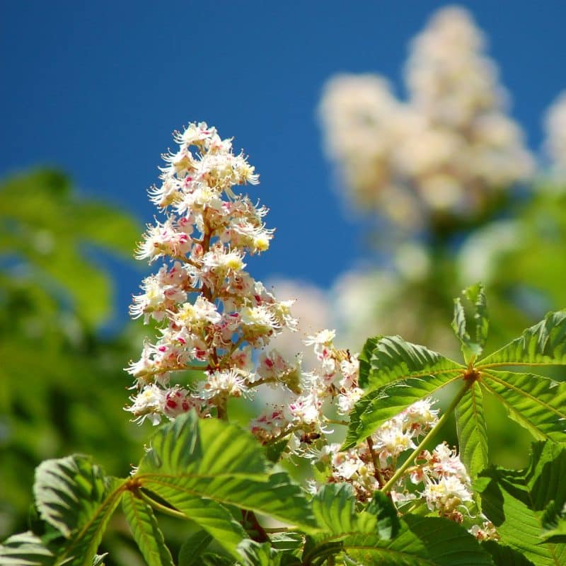 Die Blüten der Kastanie stehen meist in Trauben oder Ähren zusammen und bilden große, aufrechte Blütenstände. Jede Blüte besteht aus fünf weißen, leicht cremigen Blütenblättern, die glockenförmig angeordnet sind. Sie sind oft mittelgroß bis groß und haben einen Durchmesser von 2 bis 4 Zentimetern. Sie zeichnen sich durch ihre langen, goldgelben Staubblätter aus, die oft über die Blütenblätter hinausragen. Diese Staubblätter sind mit Pollen beladen und locken Bienen und andere Bestäuber an, die die Blüten bevölkern. Die Blüten der Kastanie sind reich an Nektar, was sie zu einer wichtigen Nahrungsquelle für Bienen macht.