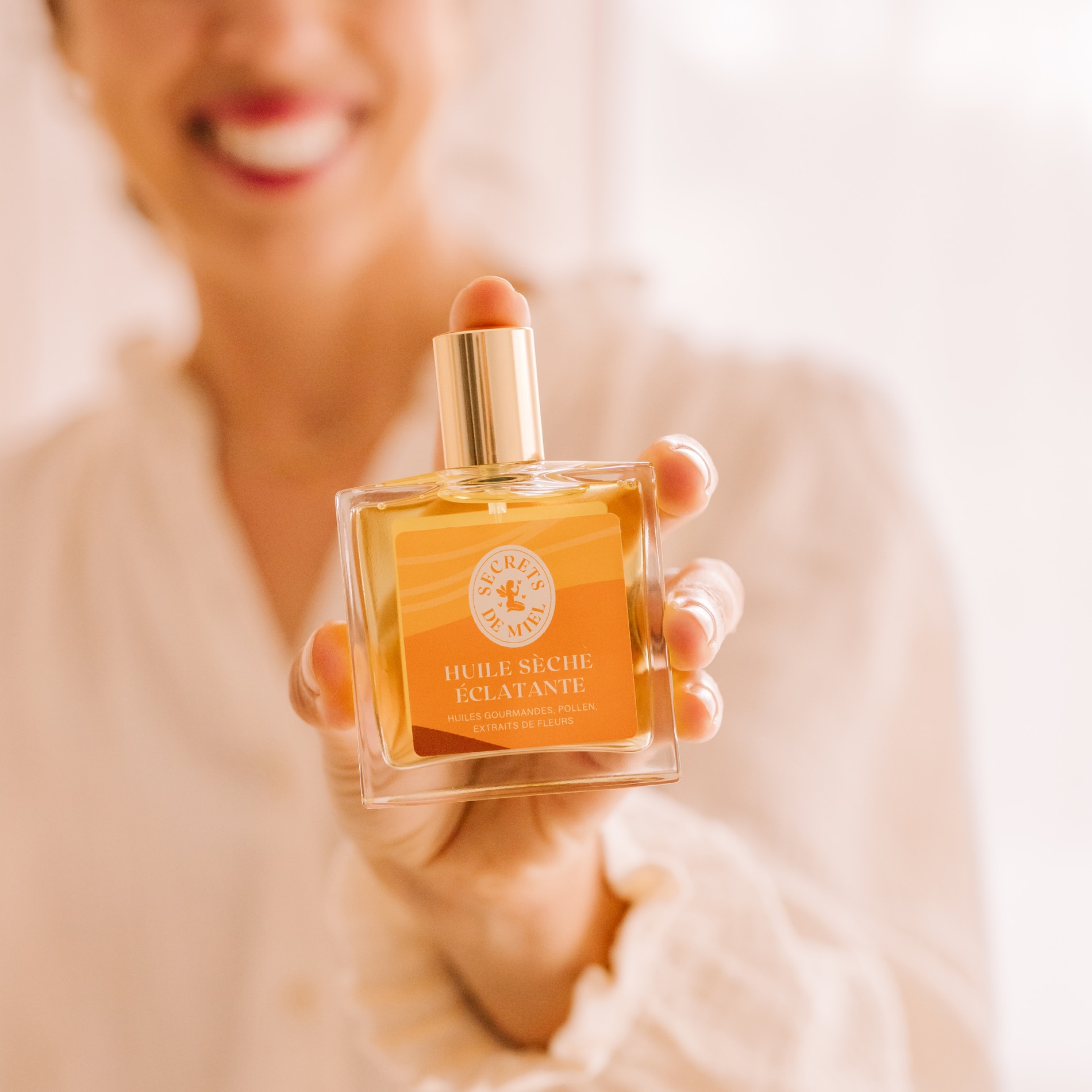 Das Strahlende Trockenöl für Gesicht, Körper und Haar tonisiert, verschönert und pflegt den Körper von Kopf bis Fuß. Es zieht schnell ein und hinterlässt einen zarten und berauschenden Duft, der Haut und Haar strahlend schön macht.