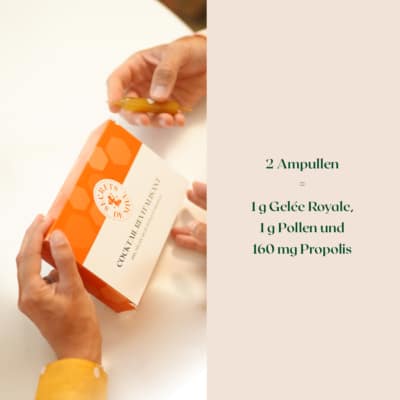 2 Ampullen = 1 g Gelée Royale, 1 g Pollen und 160 mg Propolis.