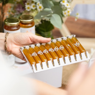 Dieser wunderbare Cocktail vereint die vier Wunder des Bienenstocks, die für ihre unzähligen positiven Eigenschaften bekannt sind. Alle Eigenschaften des berühmten Gelée Royale, kombiniert mit Propolis, einer echten Schutzbarriere des Bienenstocks, Honig und Pollen, machen diese Ampulle zu einem magischen und unverzichtbaren Verbündeten für Ihre Vitalität und Ihren Schutz im Alltag.