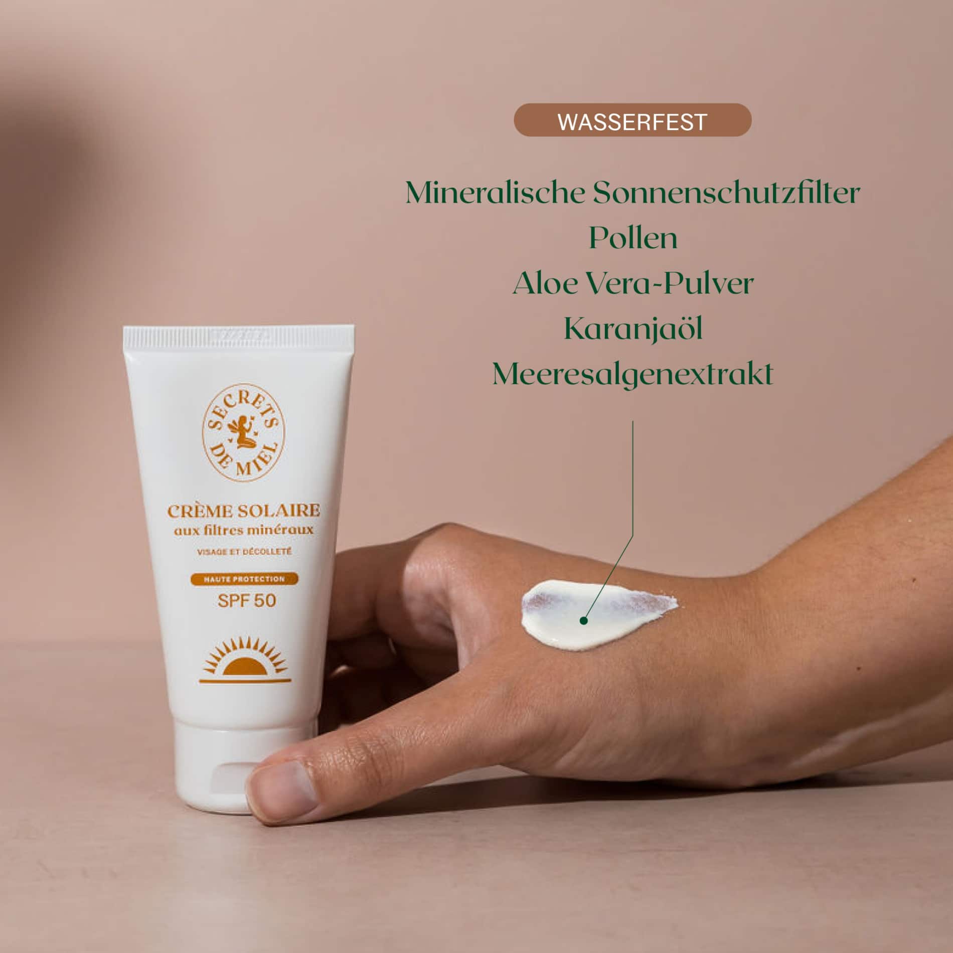 Inhaltsstoffe: Aqua (Wasser), Caprylic/Capric Triglyceride (aus Kokosnuss), Pongamia Glabra Seed Oil (Karanjaöl), Titanium Dioxide (mineralischer UV-Filter), Zinc Oxide (mineralischer Ballaststoff), Dicaprylyl Carbonate (Kokosfett), Coconut Alkanes (Kokosnussalkane), Glycerin (Hautschutz), Polyglyceryl-3 diisostearate (Emulgator), Magnesium Sulfate (Mineralfaser), Trihydroxystearin (Hautpflegemittel), Polyglyceryl-2 dipolyhydroxystearate (Emulgator), Parfum, Alumina (Absorptionsmittel), Polyhydroxystearic acid (Emulgator), Coco-caprylate/caprate (aus pflanzlichem Kokosnussöl), Gluconolacton (Gluconsäure), Jojoba esters (Jojoba), Polyglyceryl-3 polyricinoleate (Emulgator), Aloe Barbadensis Leaf Juice Powder (Aloe Vera), Pongamol (Flavonoid), Natriumbenzoat (Konservierungsmittel), Butyrospermum Parkii Butter (Sheabutter), Helianthus Annuus Seed Oil (Sonnenblumenöl), Alaria Esculenta Extract (Braunalgen), Tocopherol (Vitamin E), Pollen Extract (Pollen), Calcium Gluconat