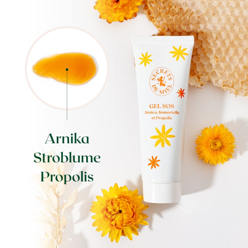 Das SOS-Gel, mit Arnika, Strohblume & Propolis ist Ihr natürlicher Verbündeter, um die kleinen Wehwehchen des Alltags schnell zu lindern: Beulen, Blutergüsse, Stöße. Seine exklusive Formel vereint drei Wirkstoffe, die für ihre außergewöhnlichen Eigenschaften bekannt sind: