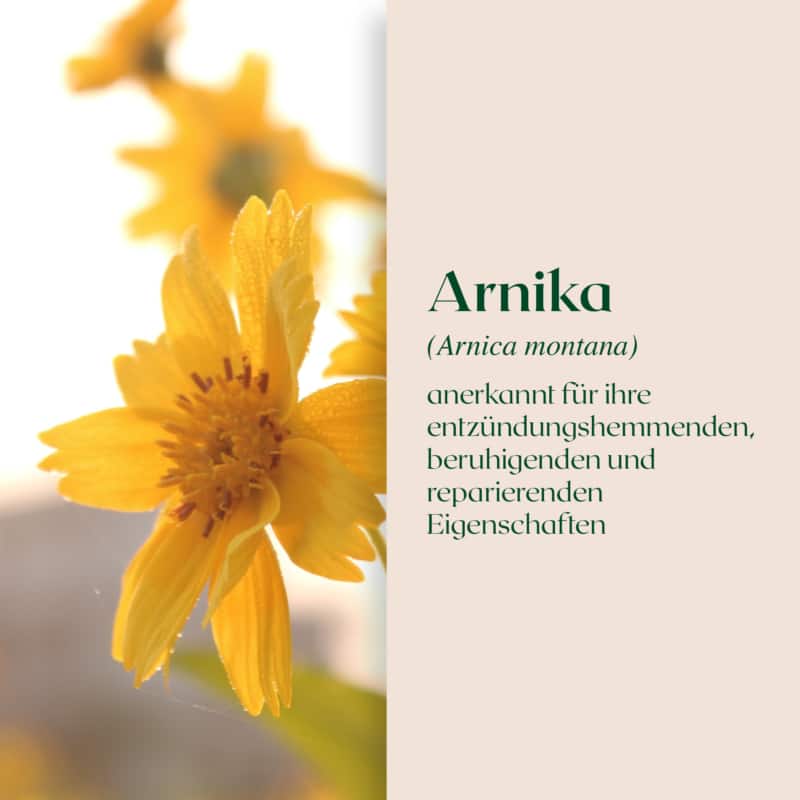 • Arnica montana : bekannt für ihre entzündungshemmenden und beruhigenden Eigenschaften, hilft sie, Beschwerden zu lindern und die Heilung bei Stößen