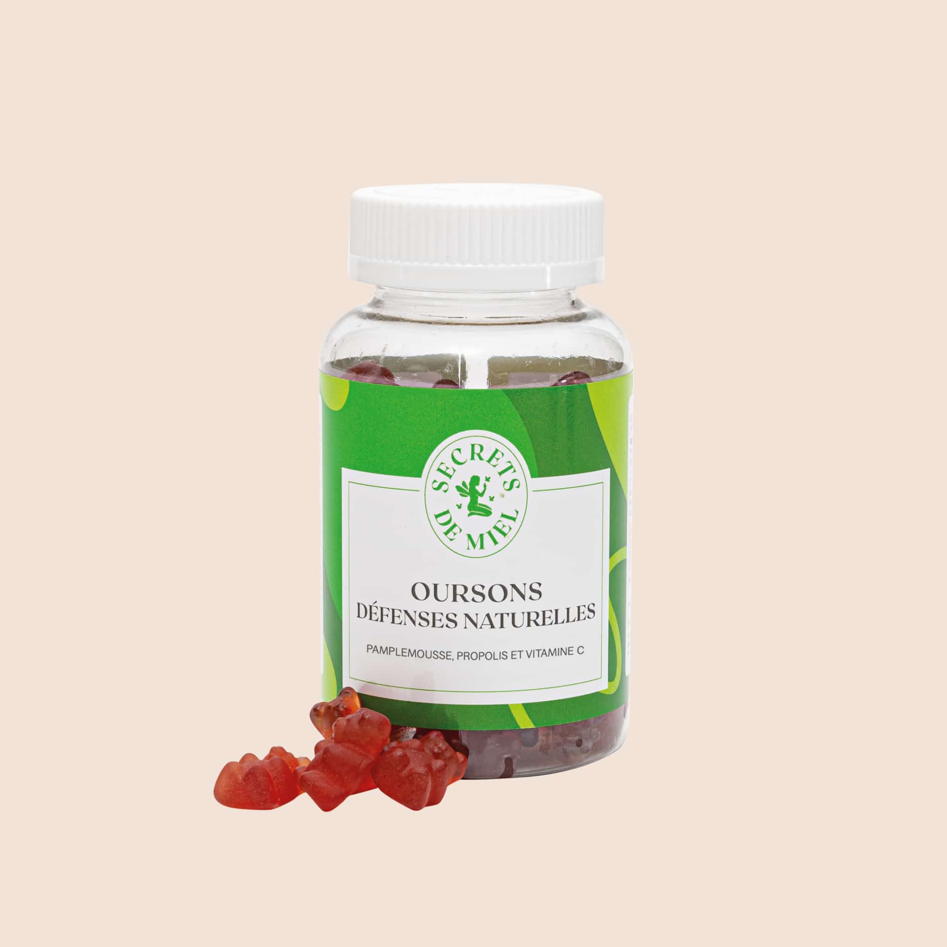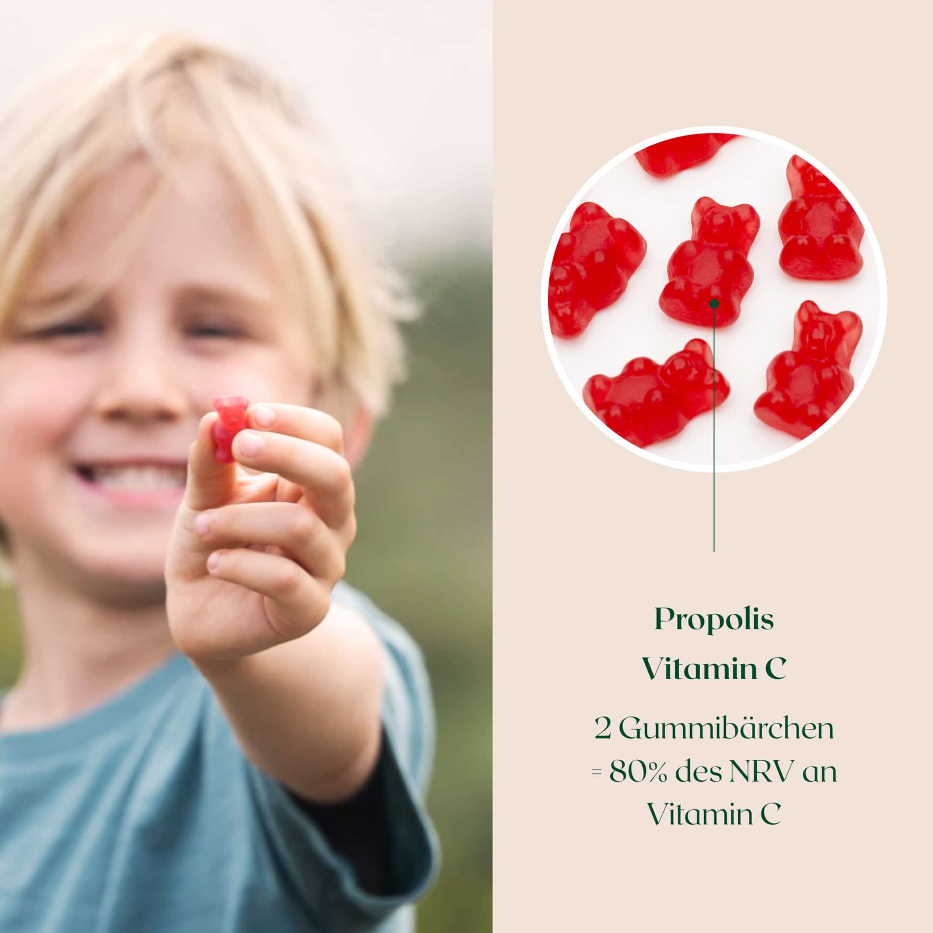 Köstliche kleine weiche Gummibonbons mit Propolis, Grapefruit und Vitamin C, das zur Aufrechterhaltung einer normalen Funktion des Immunsystems beiträgt.